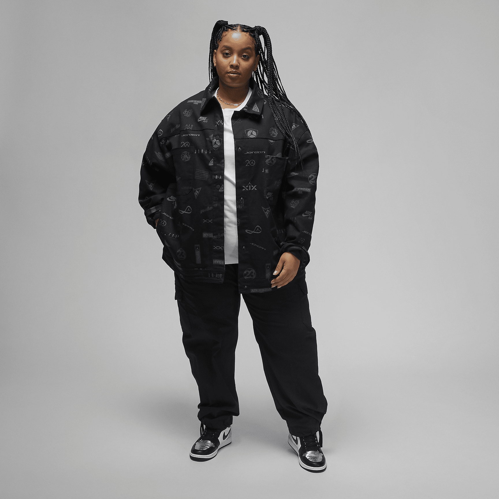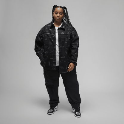 Rep the iconography of Brand in this bold trucker jacket. Designed to run roomy, the heavyweight cotton twill is accented with rubberized snaps and patch pockets. The big feature is, of course, the allover print that honors 23 of 's legendary logos. There's no better year to celebrate #23.